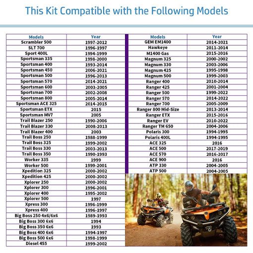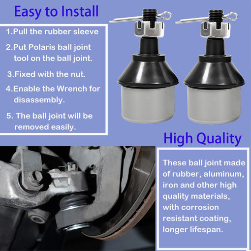 Compatibility: (Tool only) Polaris ATV/UTV models with strut-style front suspension (1985-current), including Sportsman, Magnum, Xplorer, Trail Boss, Trail Blazer, Xpedition, Scrambler, Ranger, Worker. (With ball joints) Polaris Sportsman 400, 450, 500, 570, 600, 700, 800; Ranger 400, 425, 500, 570, 700, 800; Magnum 325, 330, 425, 500; Trail Blazer, Trail Boss, Worker, Xplorer, ACE, Big Boss models (1988-2022).