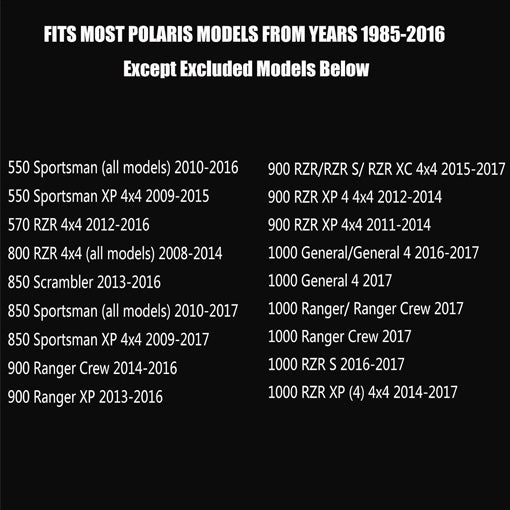 Compatibility: Polaris ATVs, UTVs, and snowmobiles 1985-2016