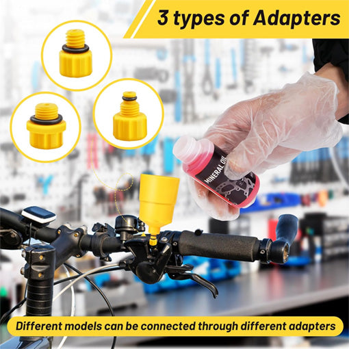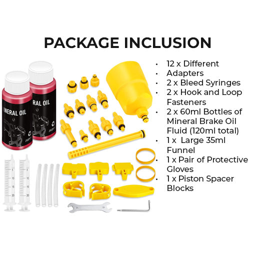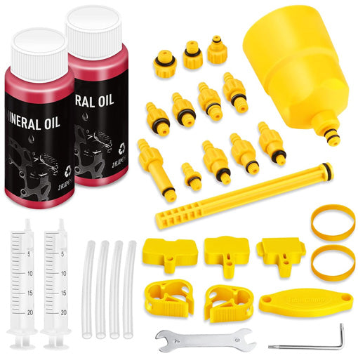 A: The kit includes a 35ml transparent funnel, two 60ml mineral oil bottles, two bleed injectors, and 12–13 adapters of varying sizes to fit most common hydraulic brake models. Hook-and-loop straps and additional fittings are included for secure handling.