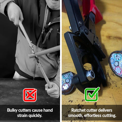 A: Unlike standard non-ratcheting cutters, this tool uses a ratchet mechanism that multiplies cutting force, allowing you to cut thick cables with far less hand effort. It prevents blade slipping, delivers cleaner and straighter cuts, and significantly reduces hand fatigue during repetitive or heavy-duty work.
