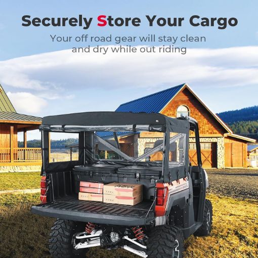 A: The combination of 600D water-resistant Oxford fabric and a steel support frame helps block rain, wind, dust, and UV exposure. Items inside the cargo bed stay cleaner, drier, and more secure even on rough terrain.