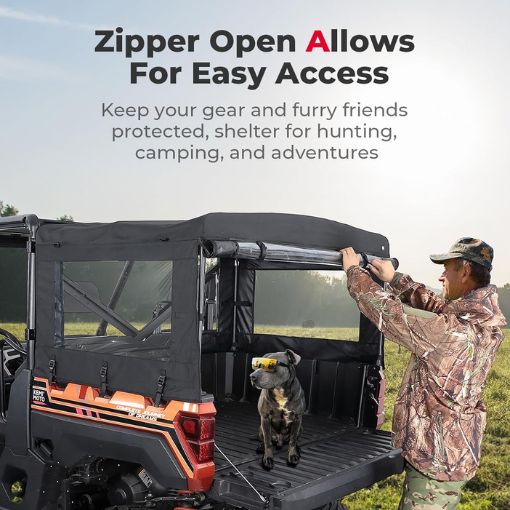 ✅ Straightforward Assembly and Access: The cover installs using a frame-and-strap system that requires no drilling, making setup simple and repeatable for work or recreational use. Side zippers and roll-up window panels provide convenient access to the cargo bed, allowing quick loading and unloading without removing the entire structure. The windows can be closed for full weather protection or rolled open for airflow, giving flexible use depending on conditions.